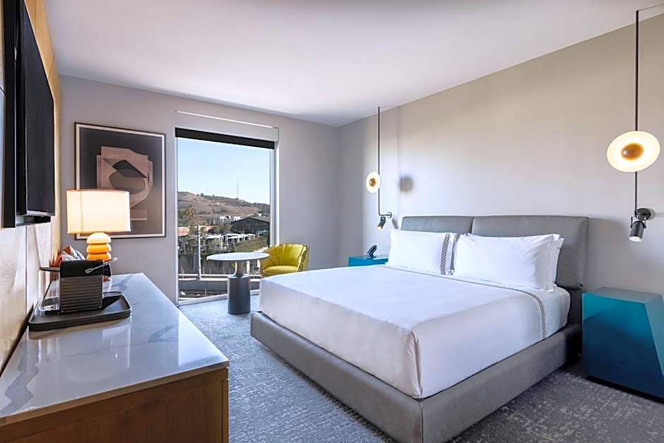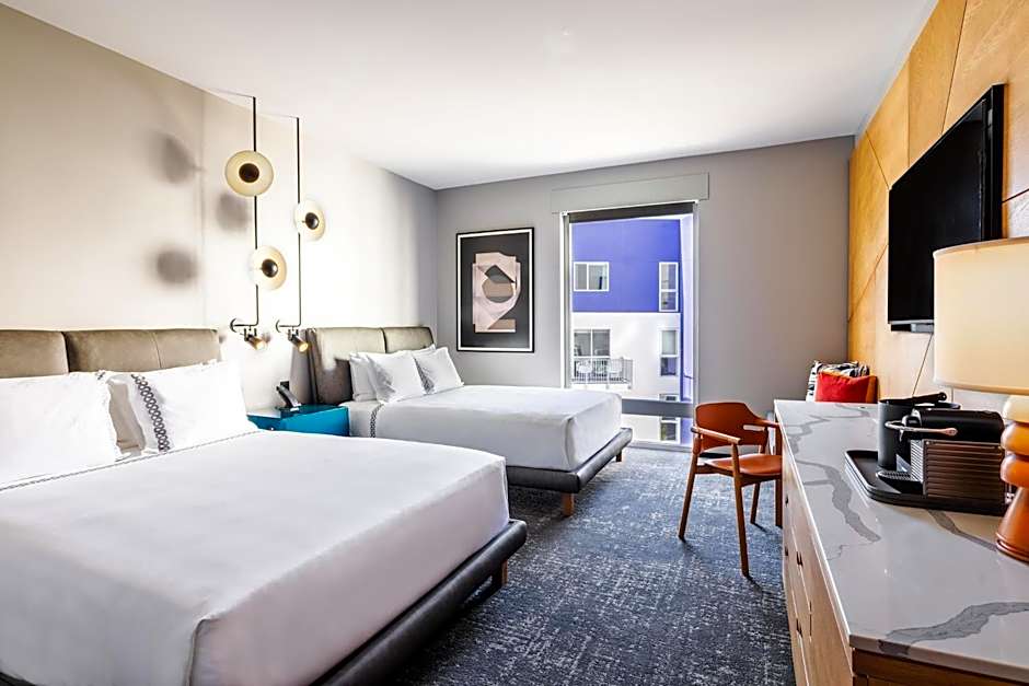 An adults-only rooftop outdoor pool anchors the scene, inviting a refreshing dip above the city. Beach chairs and loungers line the pool deck, while a terrace with views offers a serene pause after a day of LA adventures.